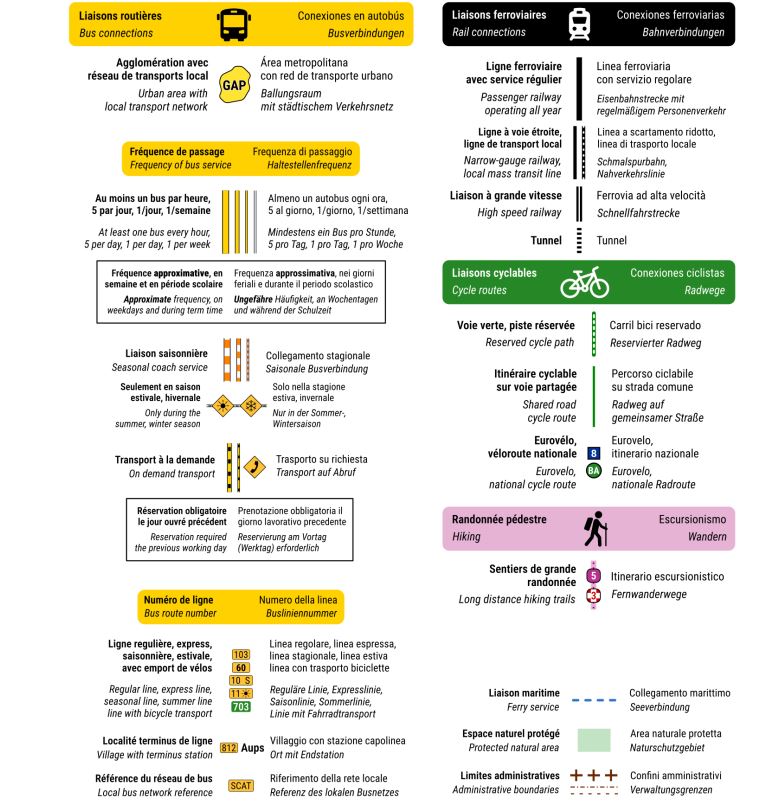 La carte recense toutes les lignes ferroviaires régulières pour voyager en train dans les Alpes, et offre un aperçu des lignes de bus dans six pays.