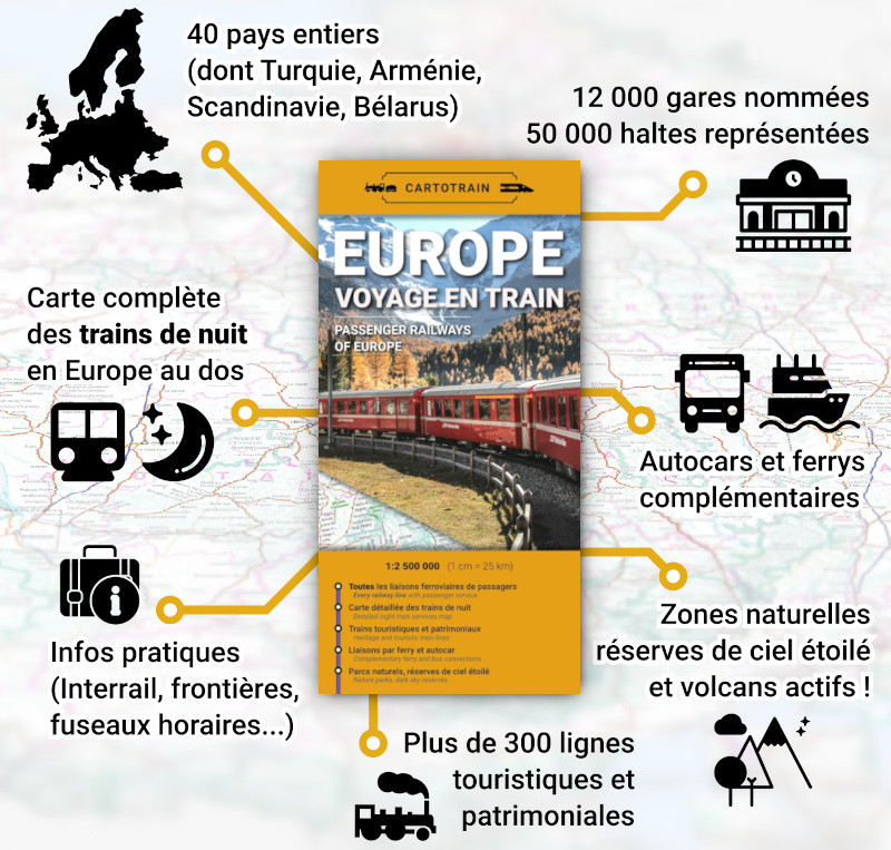 🌃 Gagnez du temps : voyagez en dormant. Le dos de la carte comprend un inventaire cartographié des trains de nuit en Europe !
